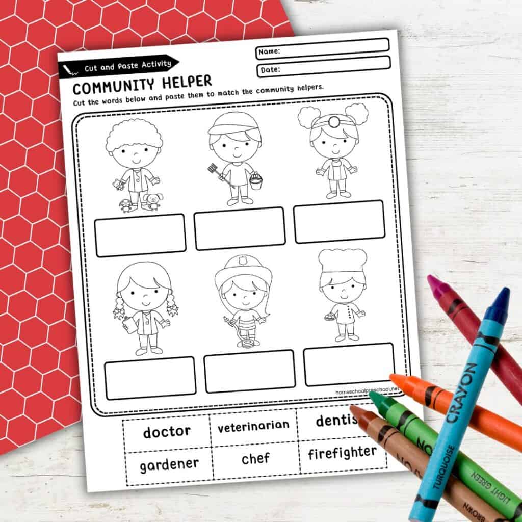 - Cut-and-paste activity – Match community helpers with their correct names.