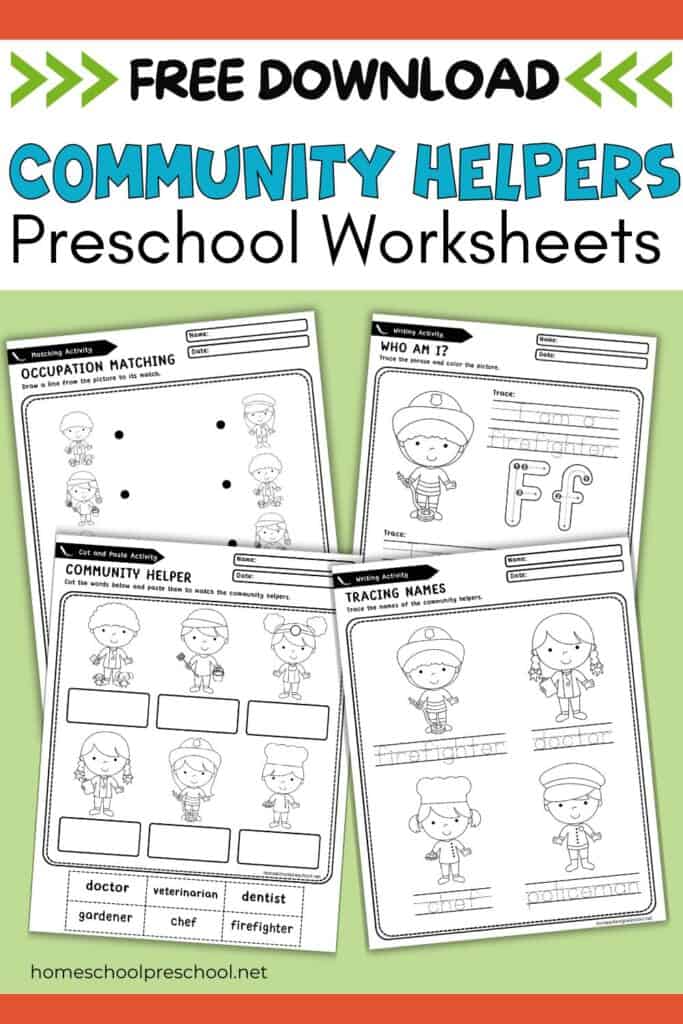 A: These printables help with so many early learning skills! Kids will practice fine motor skills through cutting, tracing, and coloring. They’ll also build vocabulary, early writing skills, and critical thinking as they match helpers to their jobs. Plus, they’ll gain a better understanding of the world around them!
