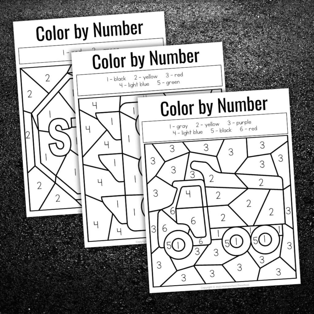 These construction color-by-number worksheets are designed primarily for preschool-aged children, typically around the ages of 3 to 5.