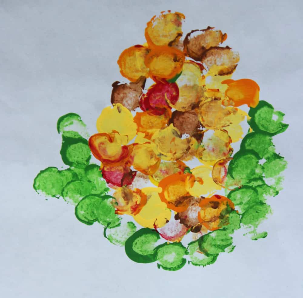 Now, ask your preschoolers to begin stamping, using one color at a time, to fill in the ear of corn. Let them use whichever colors they want in any combination they choose.