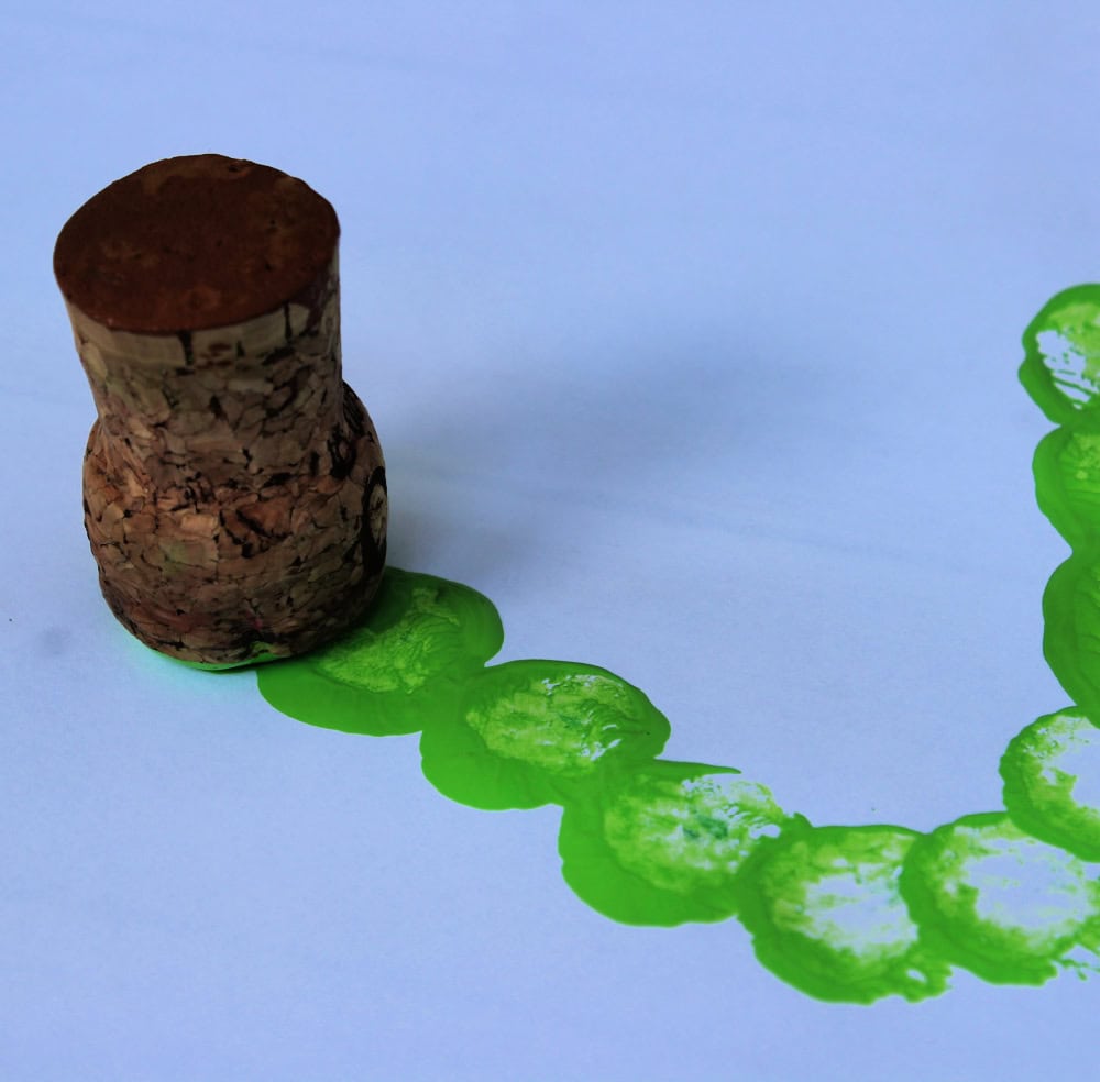 Using a cork, begin to shape the green husk of the corn cob. To make it easy for little ones, you can draw a simple U shape on the paper for them to follow.