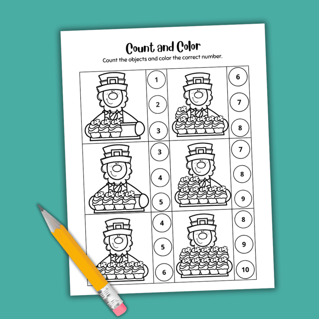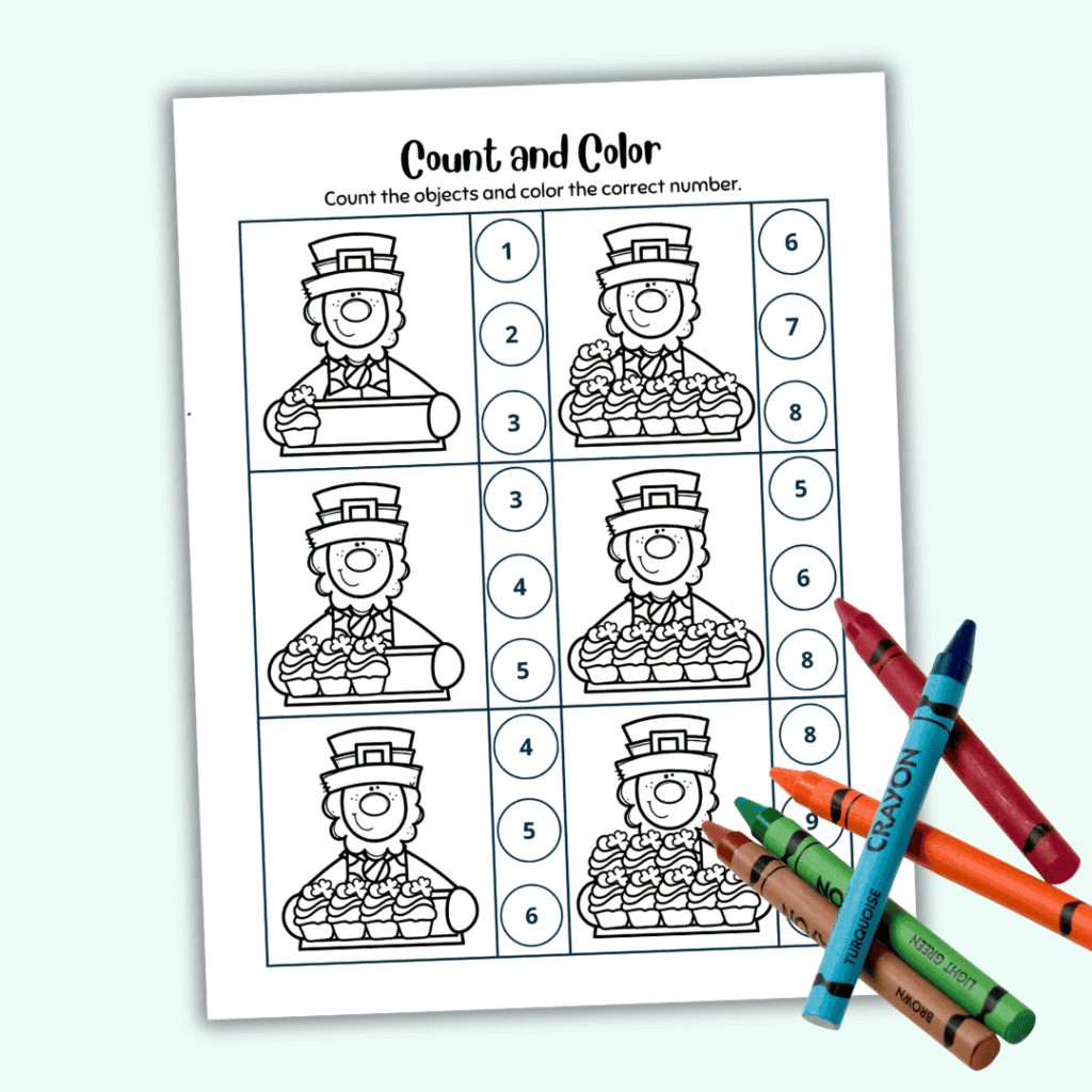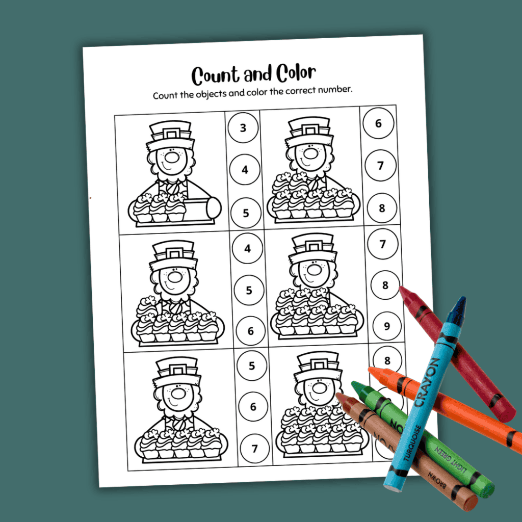 Provide your child with a set of crayons and encourage them to color the leprechauns before counting the cupcakes in each set.