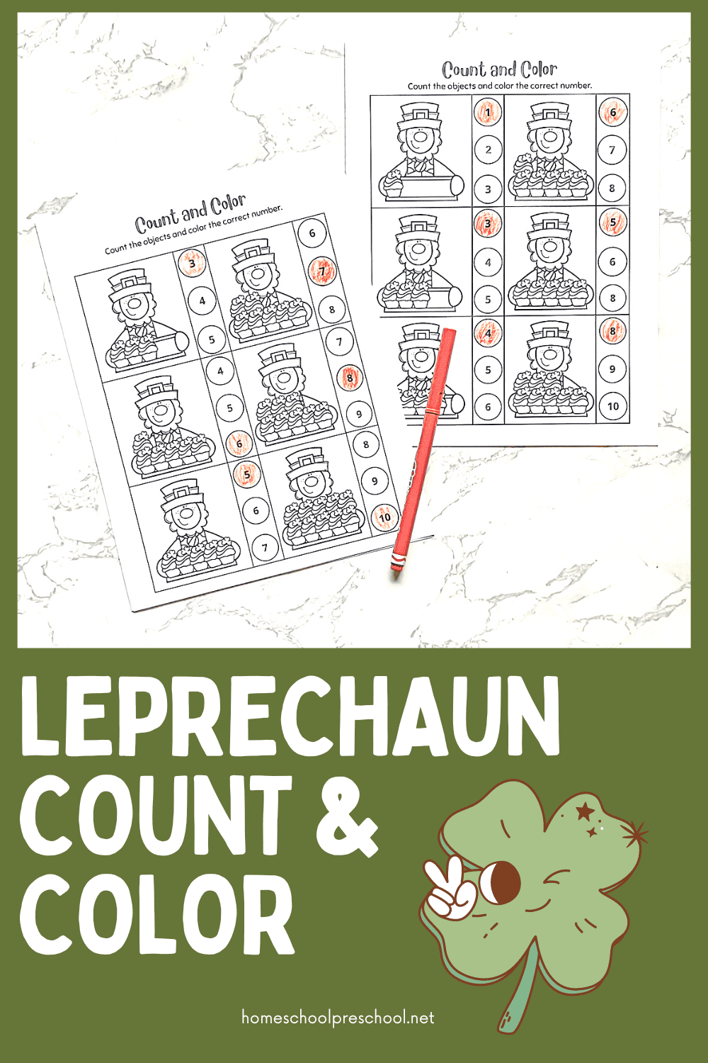 Your preschoolers will count each set of objects and identify the correct number in the box provided. They can use crayons to color the leprechauns, as well.