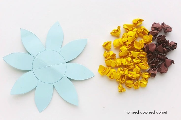 Crumple the paper squares into small balls one by one. Trace the sunflower pattern (at the bottom of this post) on construction paper. Cut out the shapes.