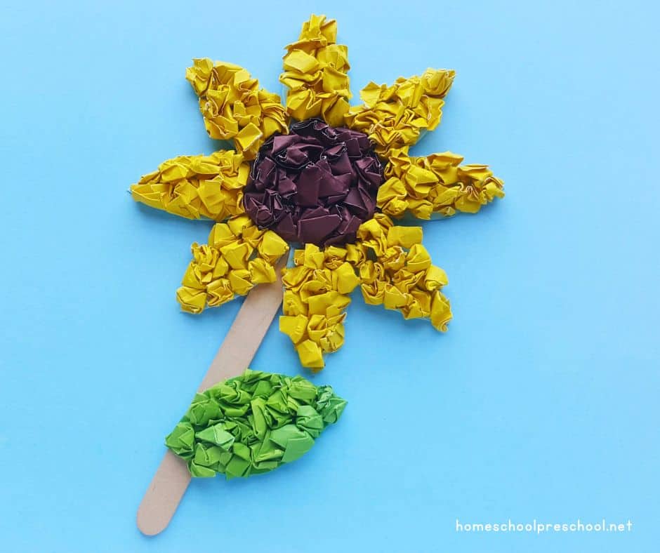 This crumpled paper sunflower craft is a fantastic preschool activity that uses basic materials and encourages creativity. Kids will enjoy making their own textured sunflowers using crumpled paper to give the flowers a unique, handmade look.