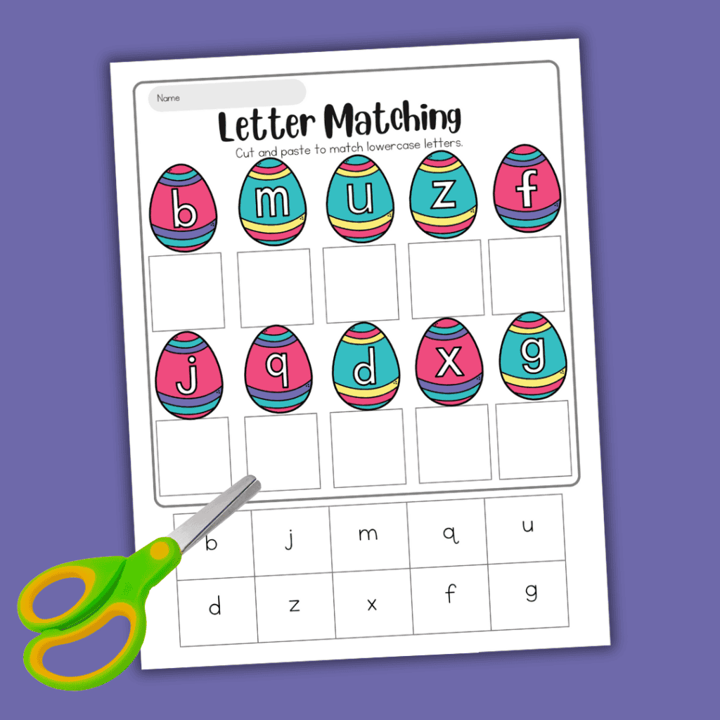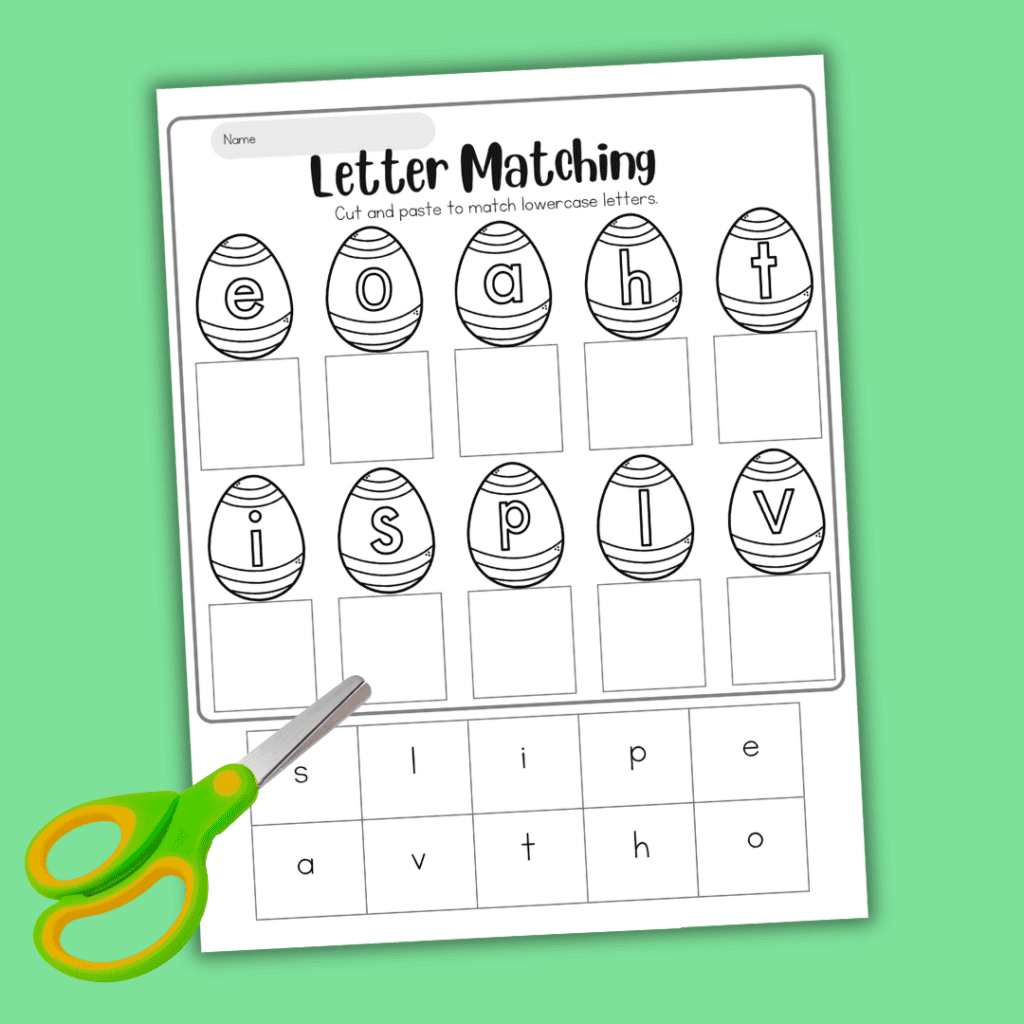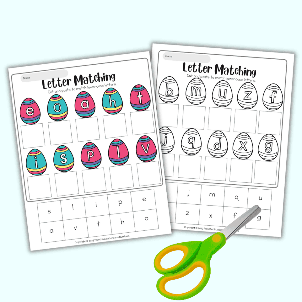 This activity pack encourages preschoolers to identify lowercase letters on colorful Easter eggs. Then, they’ll cut out lowercase letters at the bottom of the page and match them to the correct Easter egg.
