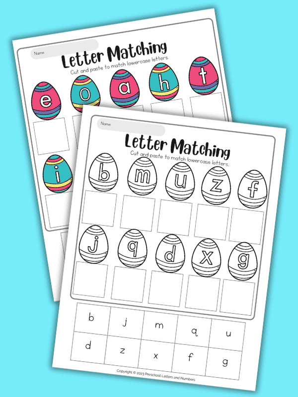 When kids complete this activity, they’ll practice identifying and matching lowercase letters. Plus, cutting out the letters helps preschoolers strengthen fine motor skills while gluing the letters develops hand-eye coordination.