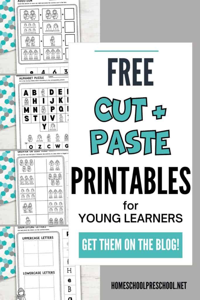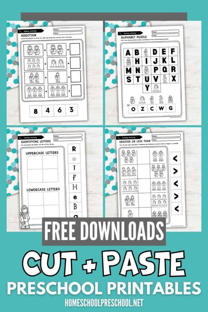 Get your preschoolers excited about learning with our cut and paste printables! These hands-on activities are perfect for building foundational skills like letter recognition, counting, comparing, and basic addition—all in a way that feels like play.