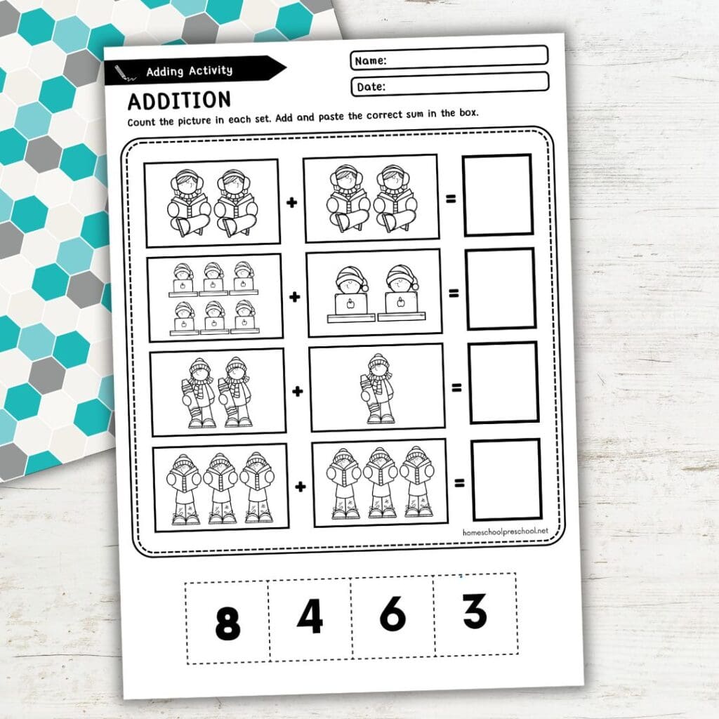 Our cut-and-paste addition practice worksheet introduces preschoolers to basic math in a fun, interactive way. Children count the objects in two groups, solve the addition problem, and cut out the correct sum to paste in the answer box.