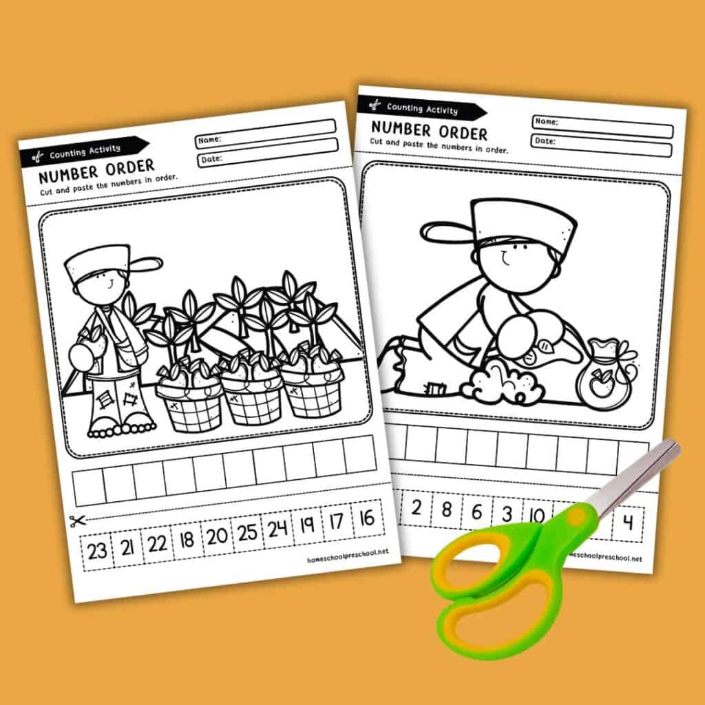 To complete the worksheets, guide your child to carefully cut out the numbered images at the bottom of each page. Then, have them paste the pictures in the correct sequence on the main page, matching the numbers in order.