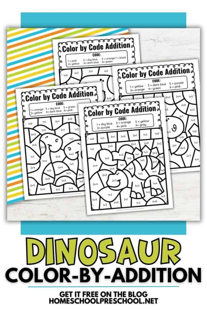 Looking for a fun way to practice addition? These dinosaur addition color by numbers worksheets are just the thing! Young learners will solve simple math problems, then use the color code to bring each dinosaur picture to life.