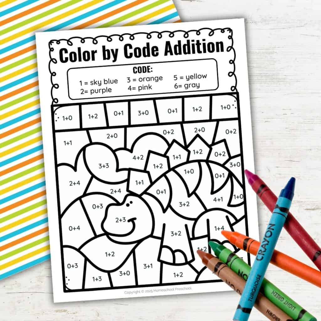 Kids can learn important early math skills with this dinosaur color by addition activity! As they solve each problem, they practice basic addition and number recognition in a fun, hands-on way. Following the color code also helps strengthen focus and fine motor skills as they carefully color each section.