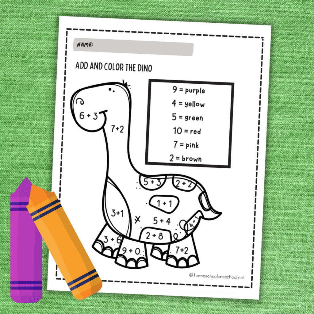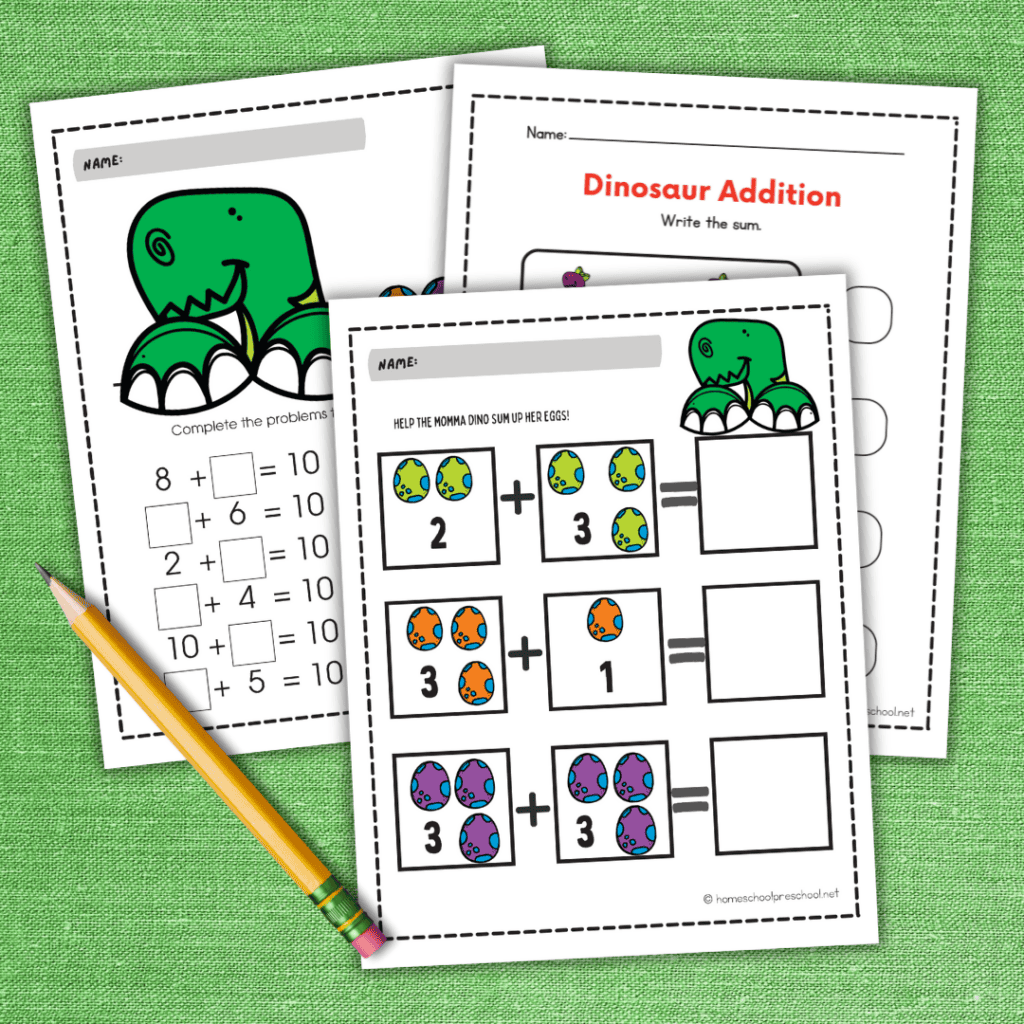In this collection of math worksheets, you’ll receive ten dinosaur addition pages. These worksheets focus on the following skills: