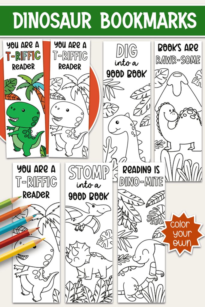 These dinosaur bookmarks are a fun way for kids to practice fine motor skills and creativity! Young learners can color, cut, and use their dinosaur bookmarks with these printables. This hands-on activity encourages patience, focus, and early literacy skills while letting kids explore their artistic side.