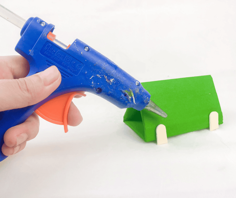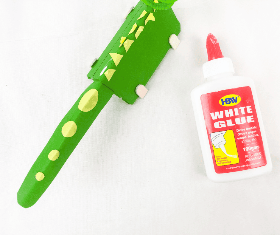 • Cut the curved tip off of two craft sticks. Glue these to the bottom of either side of the triangle. Have the curved side up and the flat side to the bottom of the triangle. Now, your dinosaur has legs.