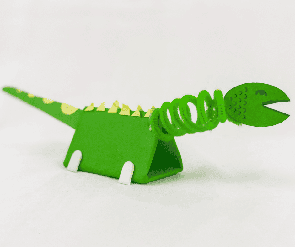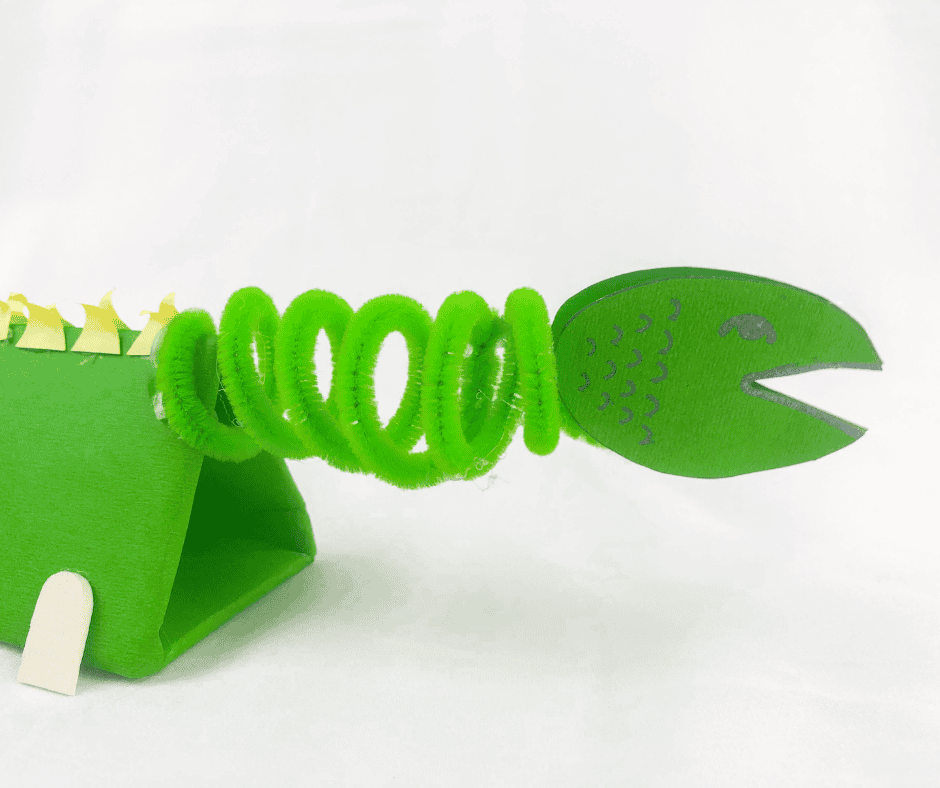 Draw a long triangle shape on the green paper. Glue or color spots on the tail to match the spikes on the dinosaur’s back. Attach the long triangle to the carton for the dinosaur’s tail.