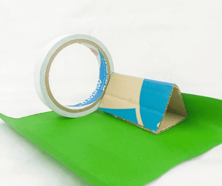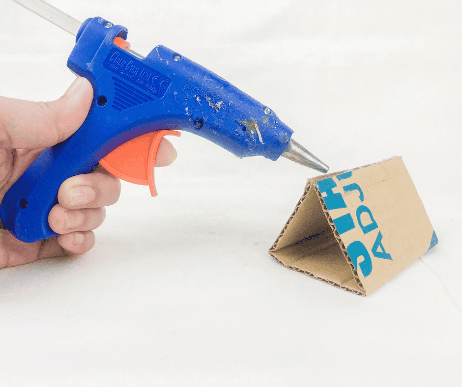 Cut a piece of cardboard to 3×5″. Then, fold it in thirds to create a triangular shape. Glue the top edges together.