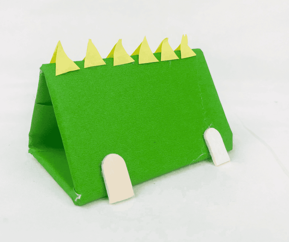 Now, cut small triangles from another color of paper. Glue these triangles to the top of the cardboard triangle for your dinosaur’s spikes.