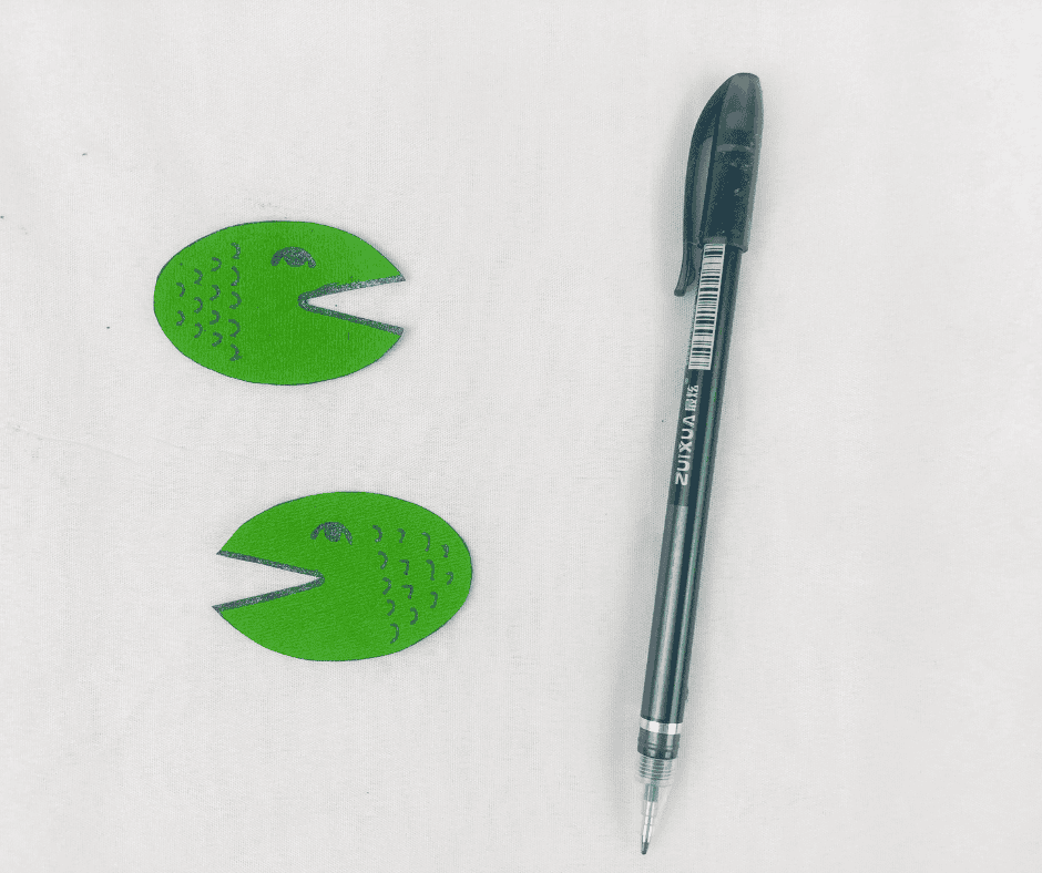 • Now, cut two ovals from a green sheet of paper. Draw an eye on each oval and a triangle slit for the mouth. (See the photo).