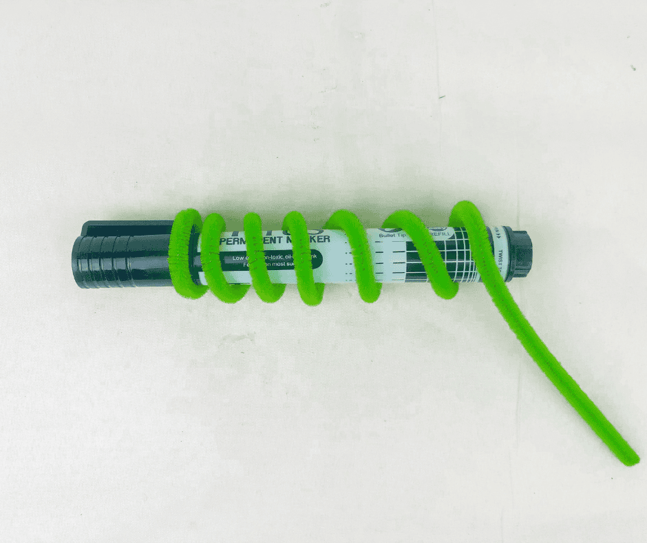 • Straighten the free end of the spiral and glue one oval to either side of the chenille stem for the dinosaur head.