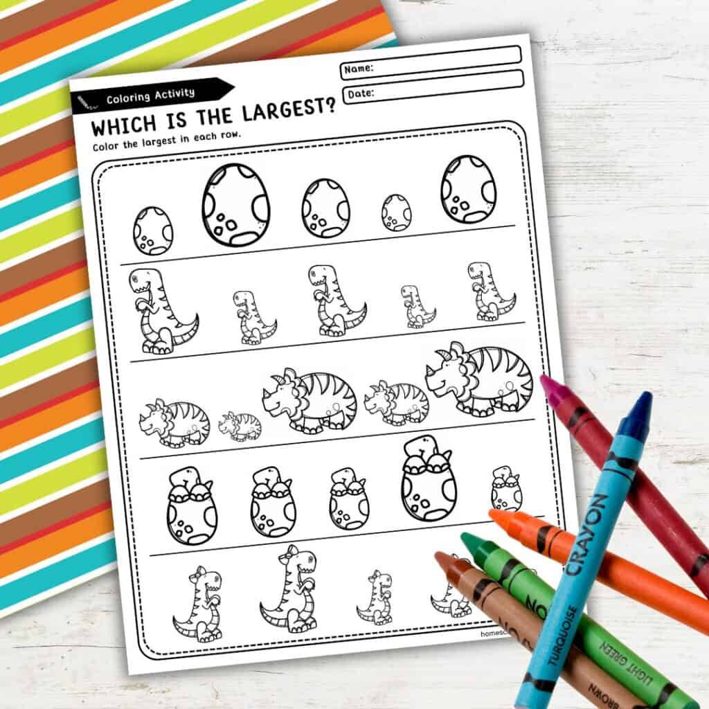 - Size sorting: Identify and color the largest dinosaur in each row.