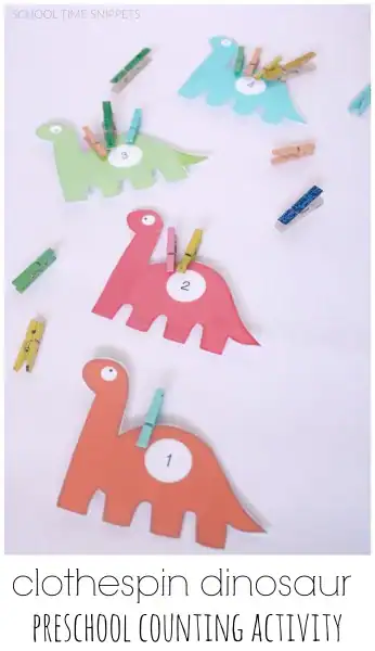 Preschoolers will work on number recognition and counting as they strengthen their fine motor skills with this clothespin dinosaur counting game.