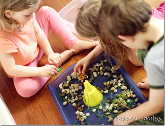 Second, you’ll need to fill your bin with a sensory-rich material. This can be anything from sand to rice to water beads.