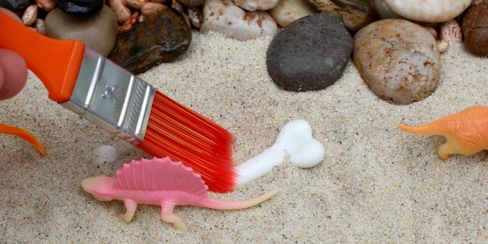 Budding archaeologists will love exploring this dinosaur fossil sensory bin!Simply bury the dinosaur skeleton bones in the sensory materials and let kids use scoop to dig them up, and use paint brush to uncover the delicate bones. Then collect all the skeleton pieces, and put them together, finish the dinosaur fossil puzzle.
