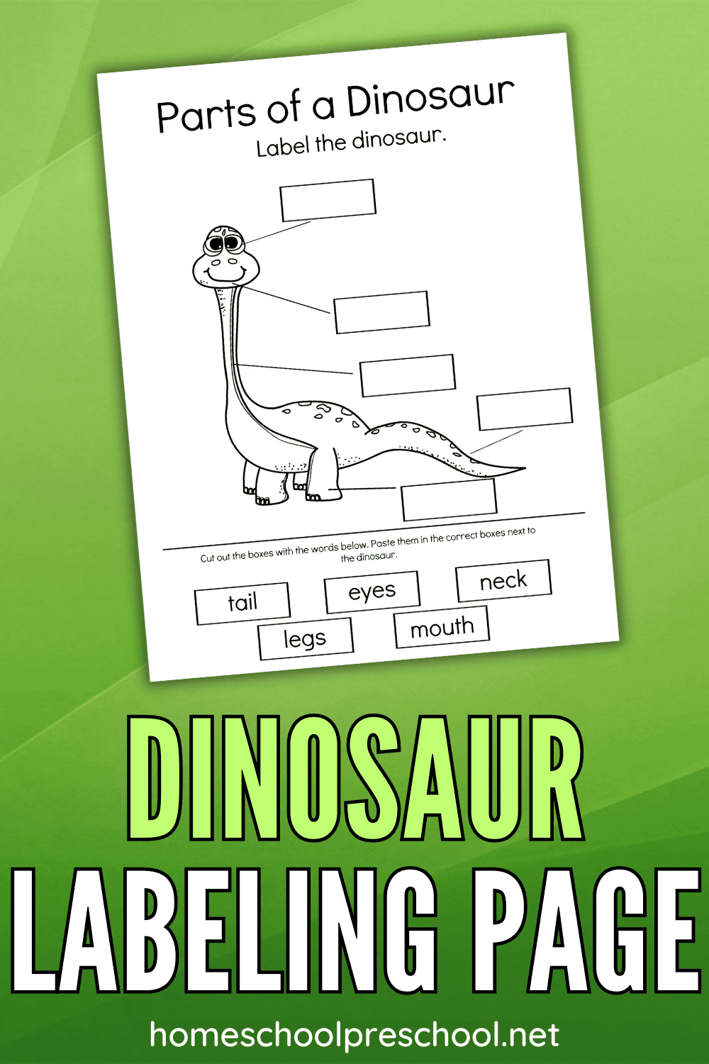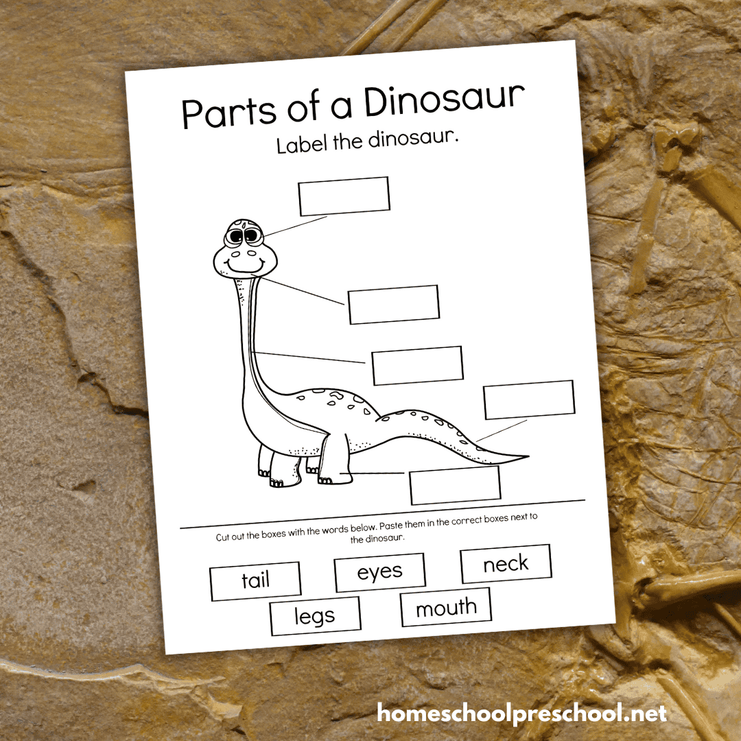 Once you have all your supplies ready, let your preschooler get started on the dinosaur worksheet. At the bottom of the page, you’ll notice several labels with the names of different parts of a dinosaur.