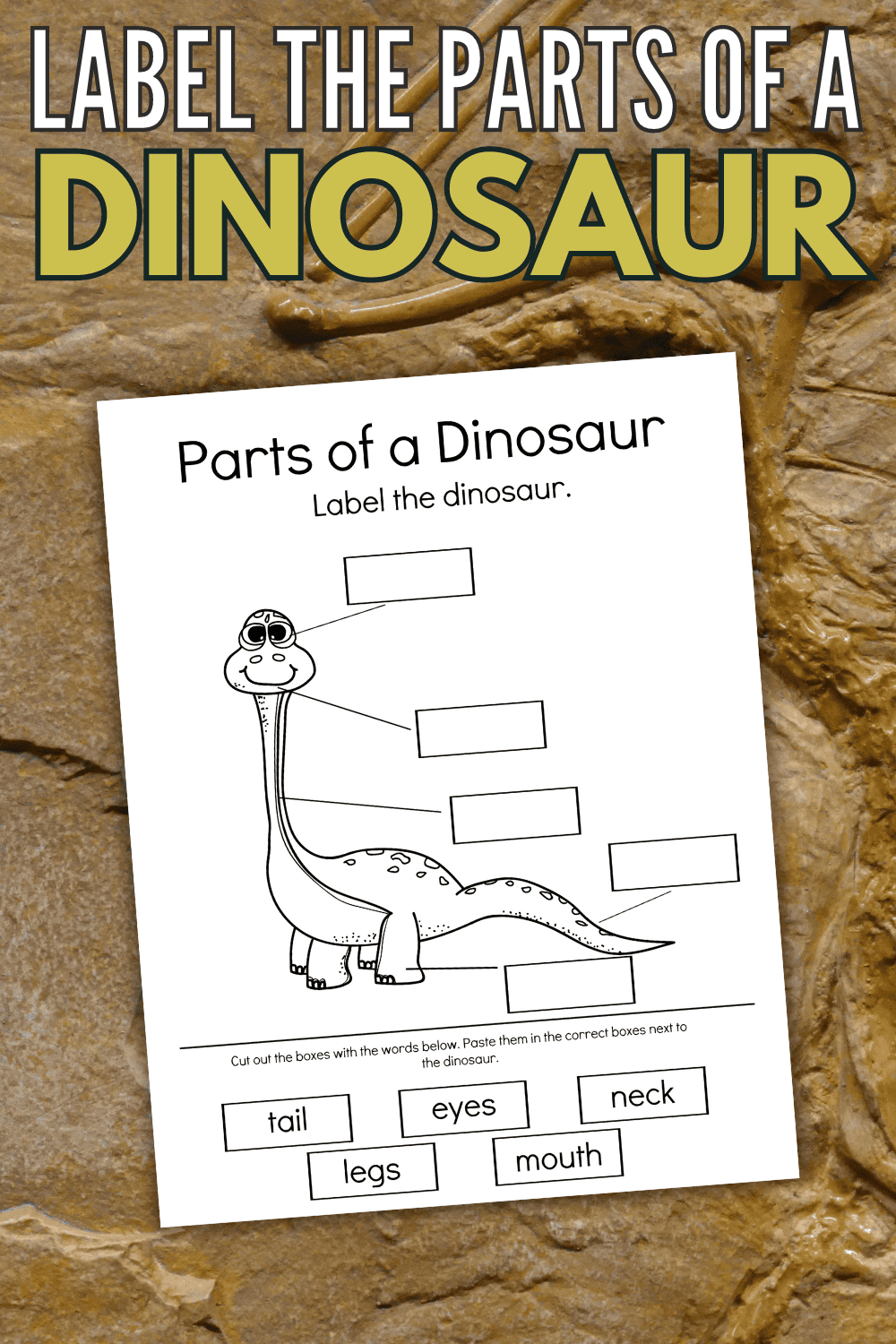 Once they’ve matched a label with its correct spot, help them apply glue to the back of the label. They can then press it onto the identified spot on the worksheet around the dinosaur.