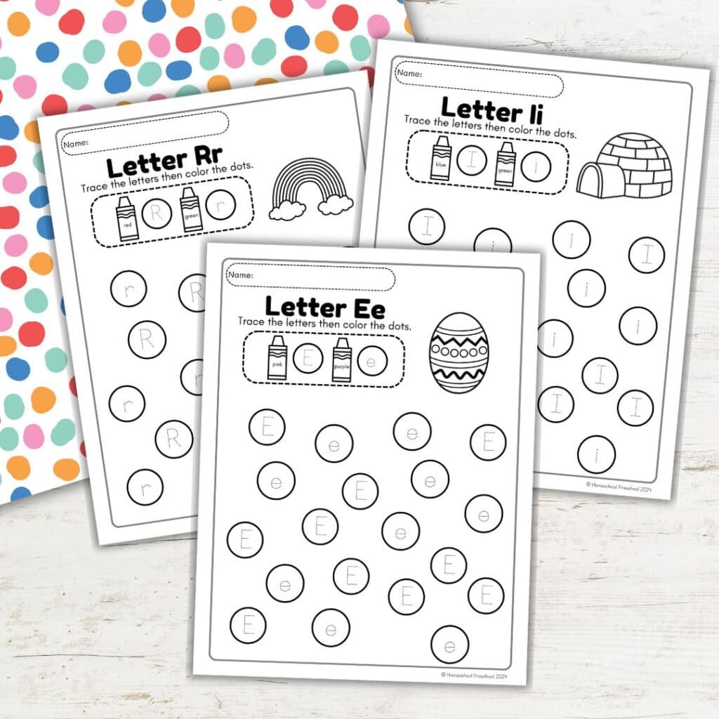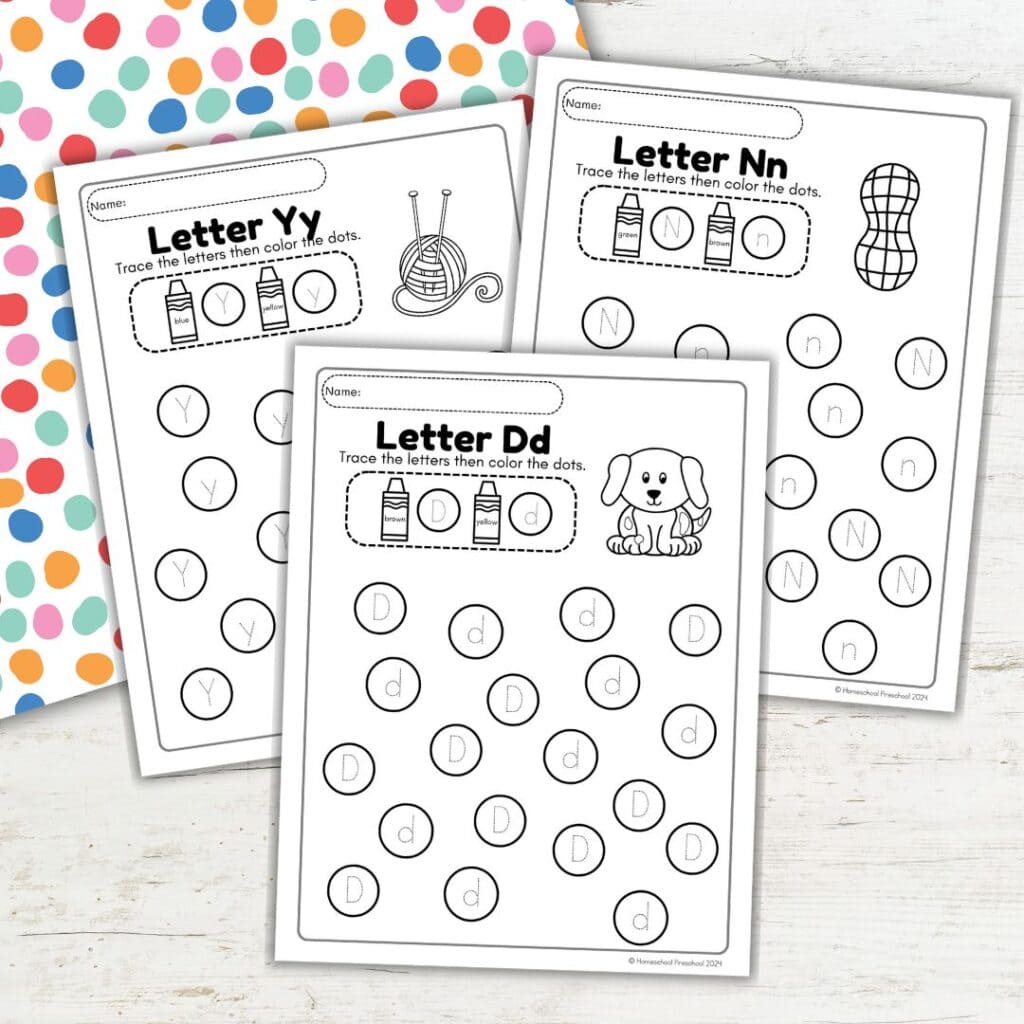 Each worksheet features playful and engaging designs that make learning letters a creative adventure. Kids will trace letters and color the dots, with different colors for uppercase and lowercase letters to reinforce their understanding.