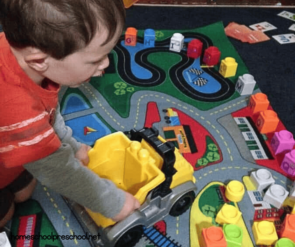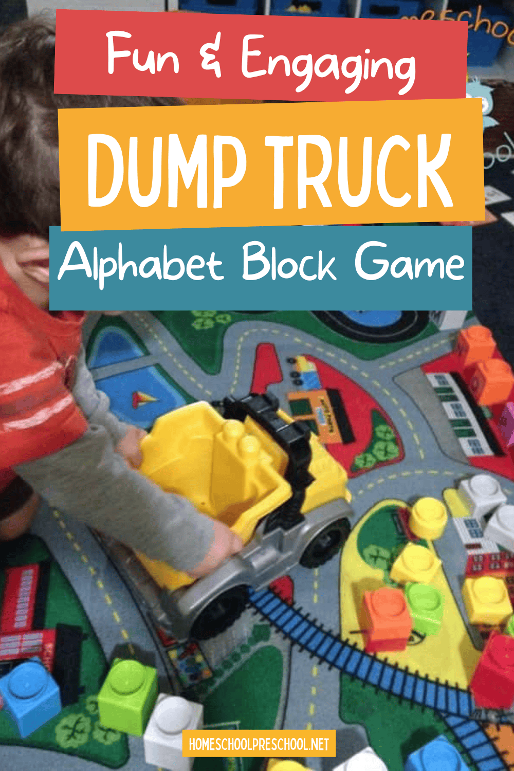 Loading the alphabet: The objective of the game is for your child to identify the letter on each card and use their dump truck to collect the matching letter blocks.