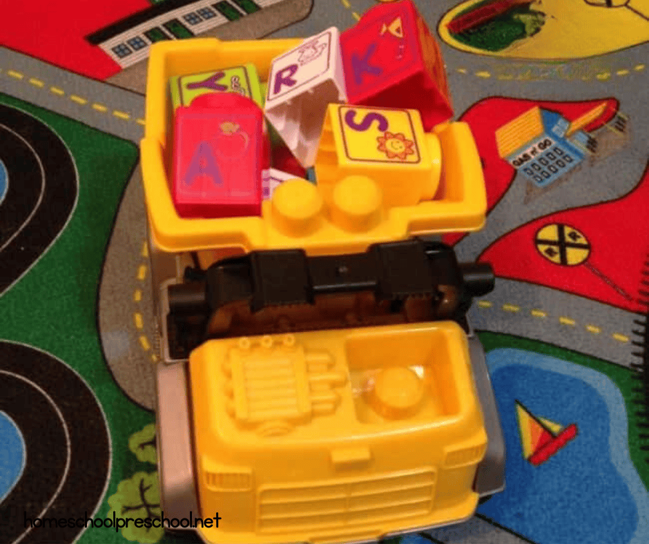Starting their engines: Have your child choose their favorite dump truck and give them a bag filled with letter cards to draw from.