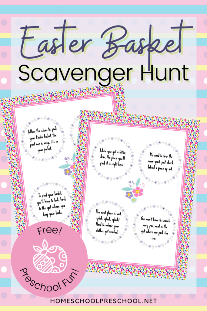 Print out these Easter scavenger hunt clues. They’re simple enough for preschoolers to solve when mom and dad read the clue aloud. What a fun way for kids to find their baskets on Easter morning!