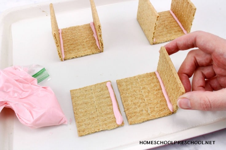 - 4. Next, pipe a line of chocolate on top of the two crackers that are standing upright. Then, take 2 more halves and place each one on the chocolate. Bend them toward each other so they touch at the top like a roof. Hold them for a minute or two so the chocolate sets.
