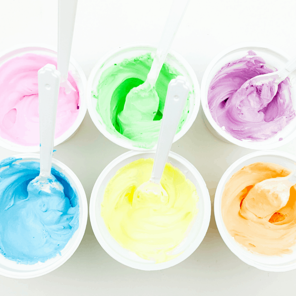 Add 1-2 drops of food coloring to each cup. Use a different spoon for each one.