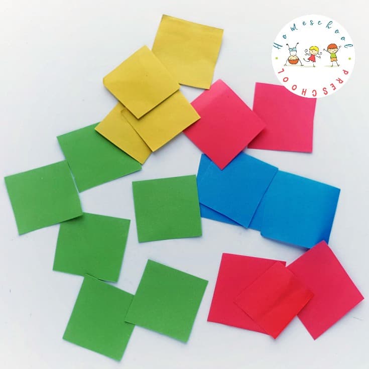 Take a square and have your preschooler crumple it into a small ball. Keep going until you have LOTS of paper squares. You will need a bunch of them for this project.