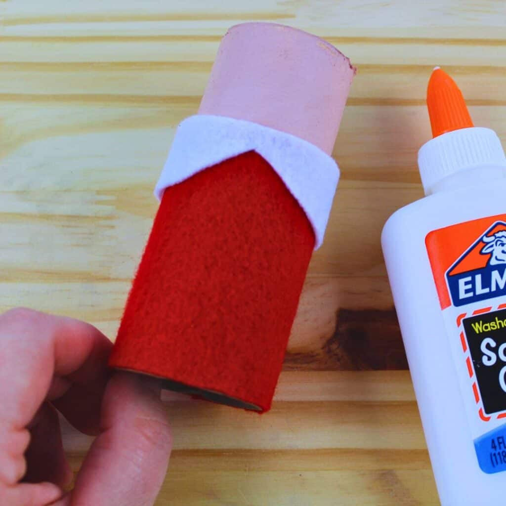 Cut the elves clothes from colored felt. Make sure the felt is long enough to wrap around the toilet tube before making a cut. Refer to the photo.