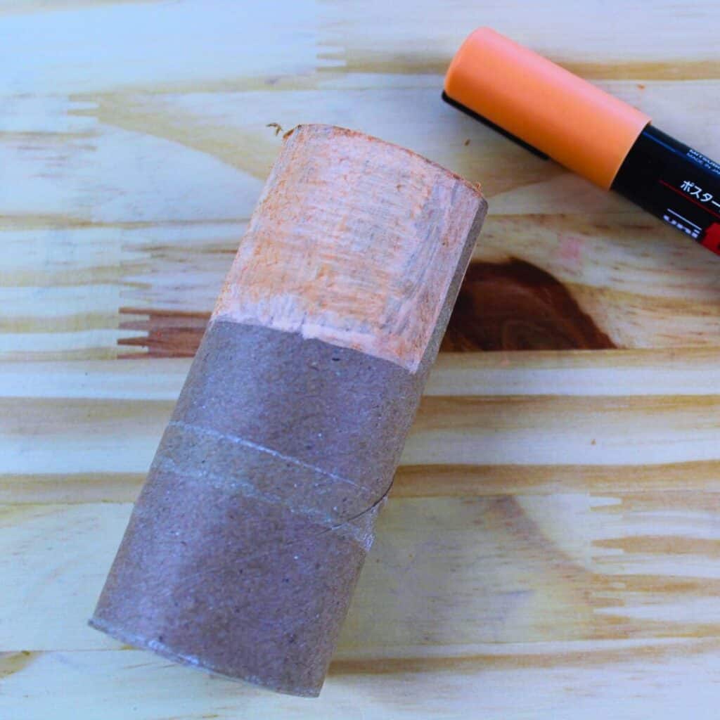 Paint the top half of a toilet paper tube a flesh toned color. You’ll need to do two coats. You can also use paint and a brush if you prefer.