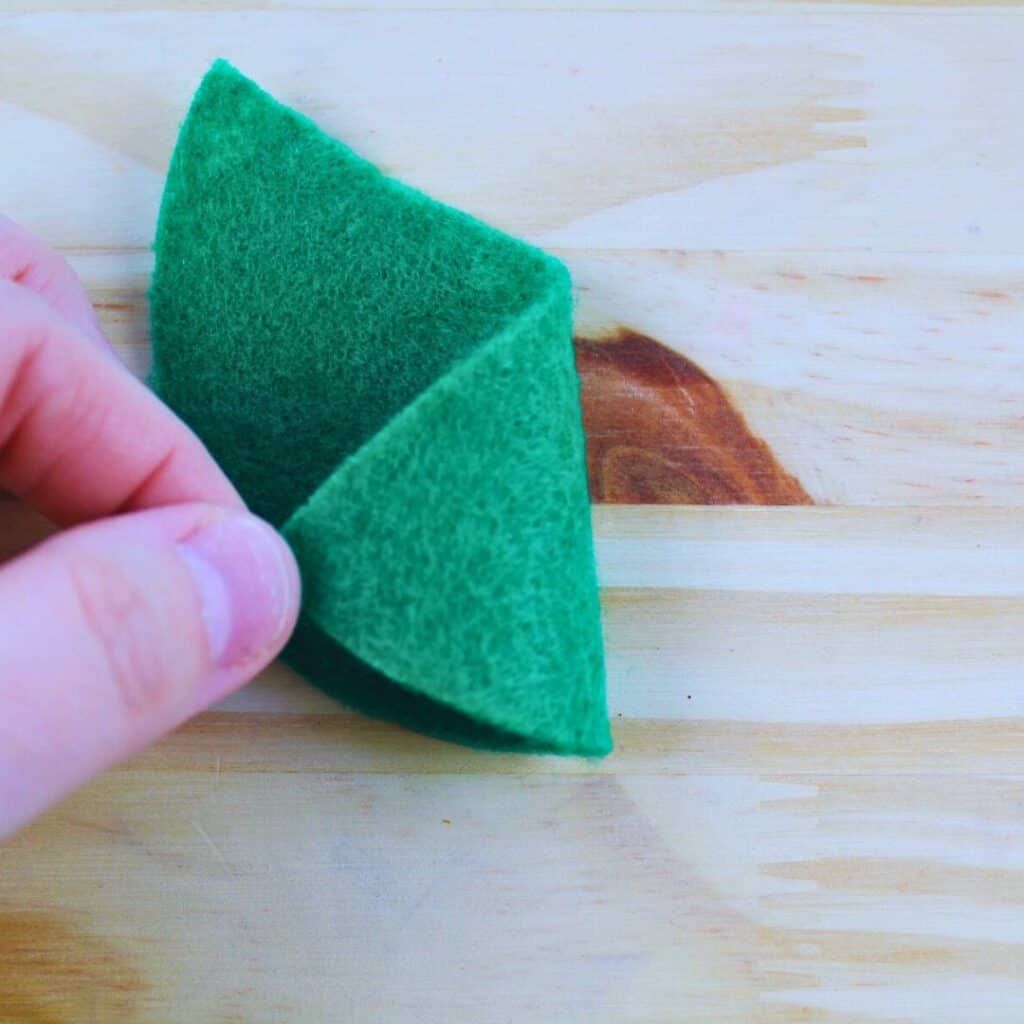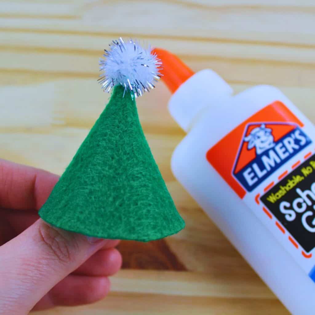 Cut half circles from felt. Fold the circles to create a cone shaped hat. Glue in place. Refer to photo.