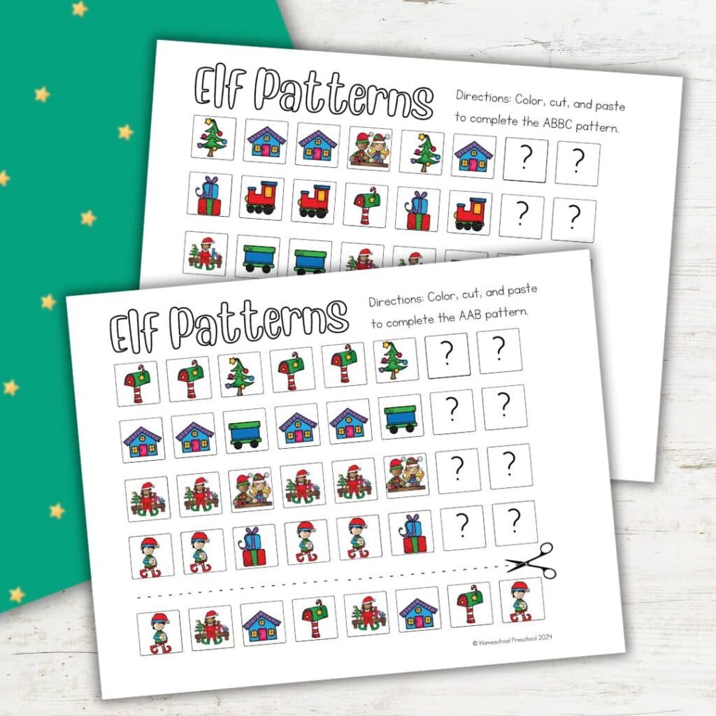 Our elf patterns pack incorporates cutting and pasting to make pattern practice interactive and hands-on. As kids cut out and arrange holiday images to complete patterns, they enjoy a creative approach to building early math skills.
