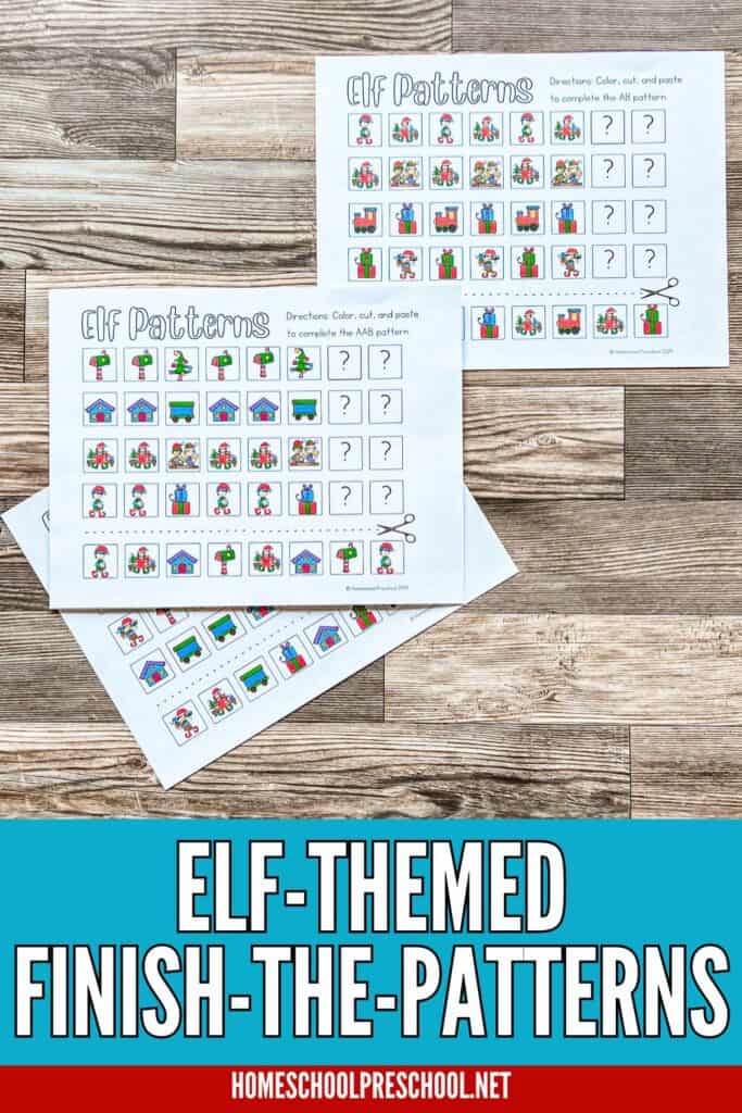 - Eight printable pattern worksheets with cute elf designs