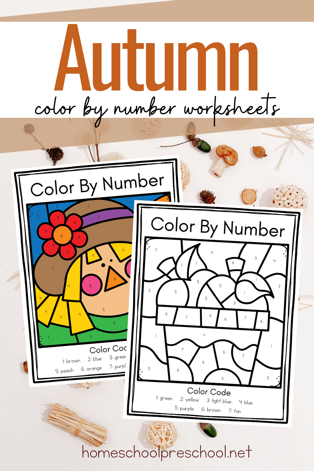 Preschoolers can work on number recognition and color words with these fall color by number worksheets. Add them to your autumn lessons.