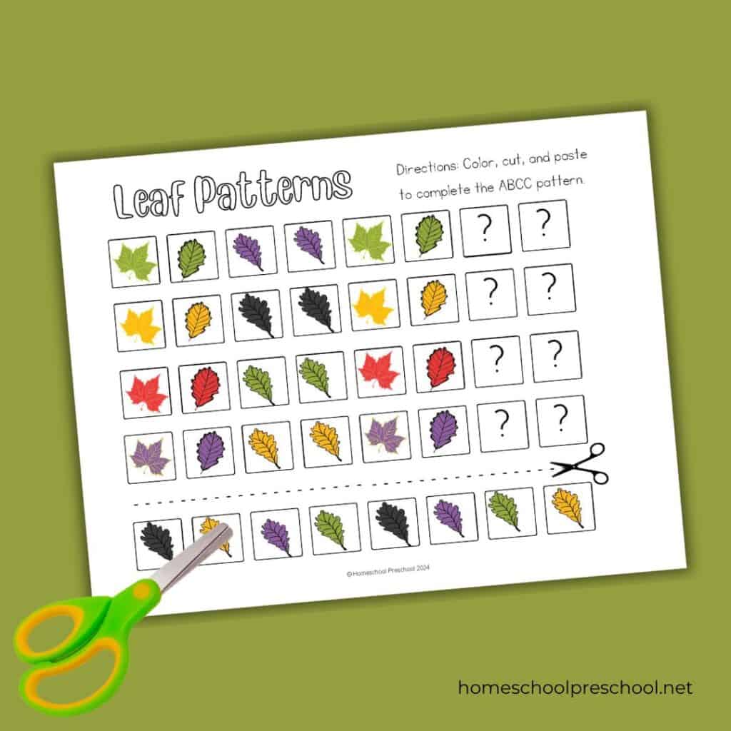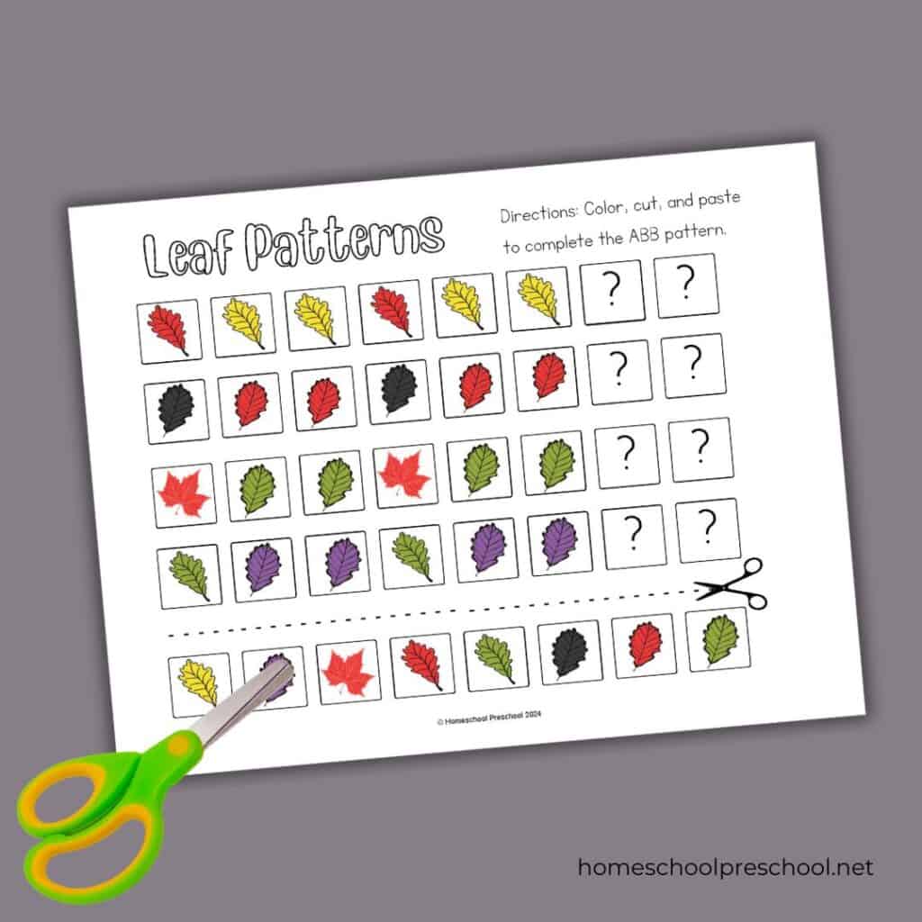 To complete the fall leaf pattern worksheet, start by explaining to the child how to recognize a pattern. Show them the first few leaves in the sequence and ask what they think comes next. Encourage them to select the correct leaf and place it on the worksheet’s next spot.