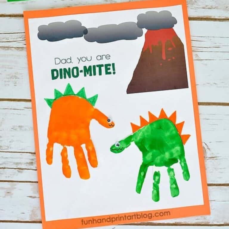 Dino-mite Dads will smile when they get a cool handprint dinosaur Father's Day card. It's a great way for two siblings to make handprint gifts together since there are spots for two colorful dinosaurs on the printable template. All you need for this handprint art idea is orange and green paint and googly eyes.