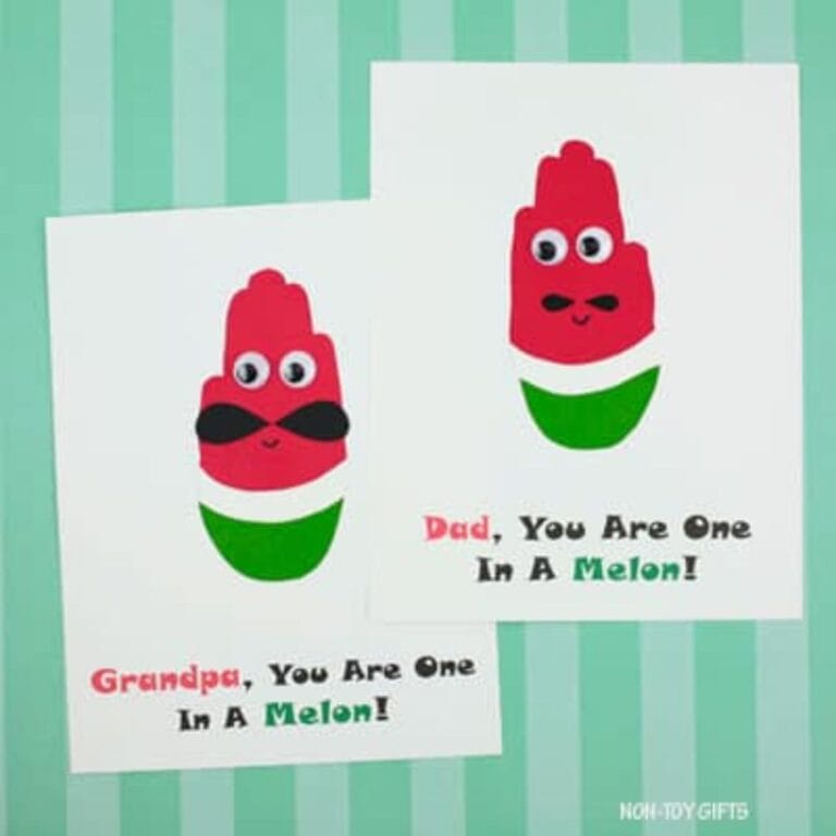 Dads who love puns and dad jokes will get a kick out of this “one in a melon” card! Make a handprint with fingers together and dress it up with googly eyes, seeds, and a rind to make it look like a watermelon.