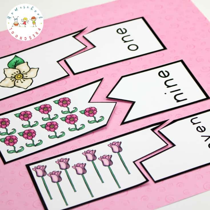 Each of these two-piece puzzles features a number word and a set of flowers to count. Print the puzzles and cut them apart.Â