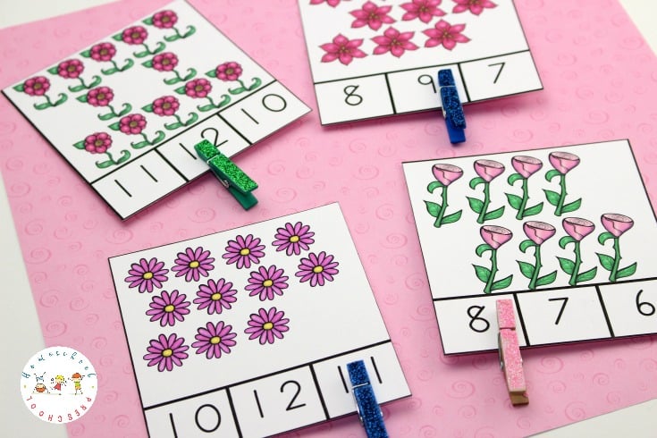 To work on one-to-one correspondence, have your preschoolers place a counter (gem, eraser, etc.) on each flower as they count out loud.