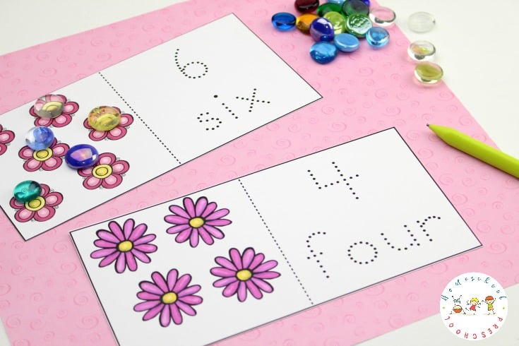This simple activity will help kids with number recognition, number words, writing, and counting. Have kids count the flowers on the left side of each card. Then, have them trace the number and number word on the right side.Â