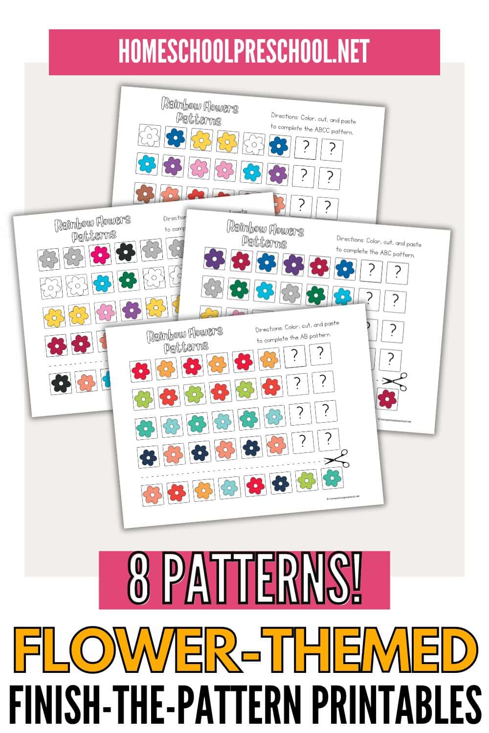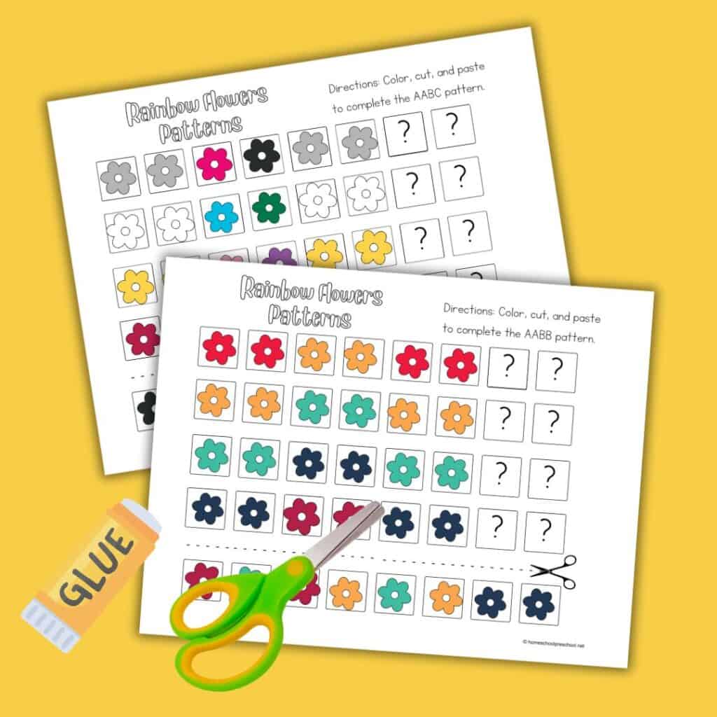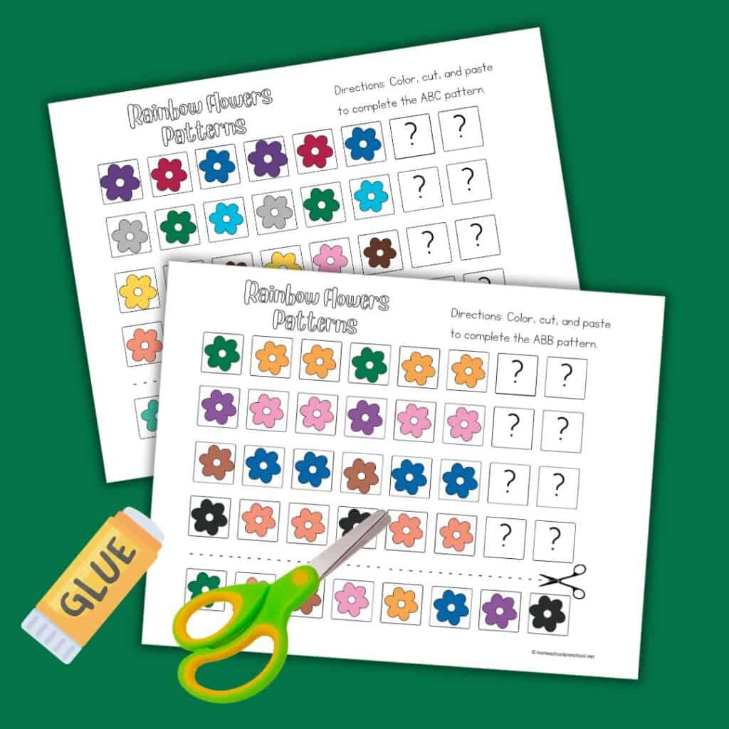 • Cut and Paste Fun: Each worksheet features a pattern with a missing element at the end. Kids will cut out the flower pictures at the bottom and paste them in the correct spot to complete the pattern.
